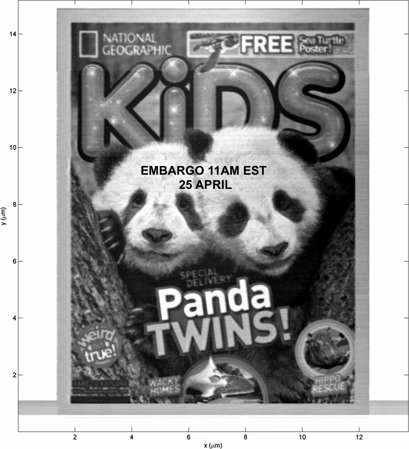 It looks much like any other cover of the children’s magazine National Geographic Kids. Cuddly animals: check. Free Sea Turtle poster: check. Story about rescued hippos: check. Only the lack of colour and the slight graininess makes you think it might be something other than the real thing. But the real reason for these imperfections is that this magazine cover is so small that a single human red blood cell would cover most of it. It measures just 11 by 14 thousandths of a millimetre, and is totally invisible to the naked eye.