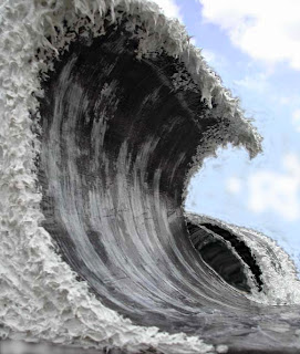 Hokusai, The Great Wave (c.1830) (top), and Athena Tacha, Wave (2004-5; lead sheet and silicone sealant) (bottom).